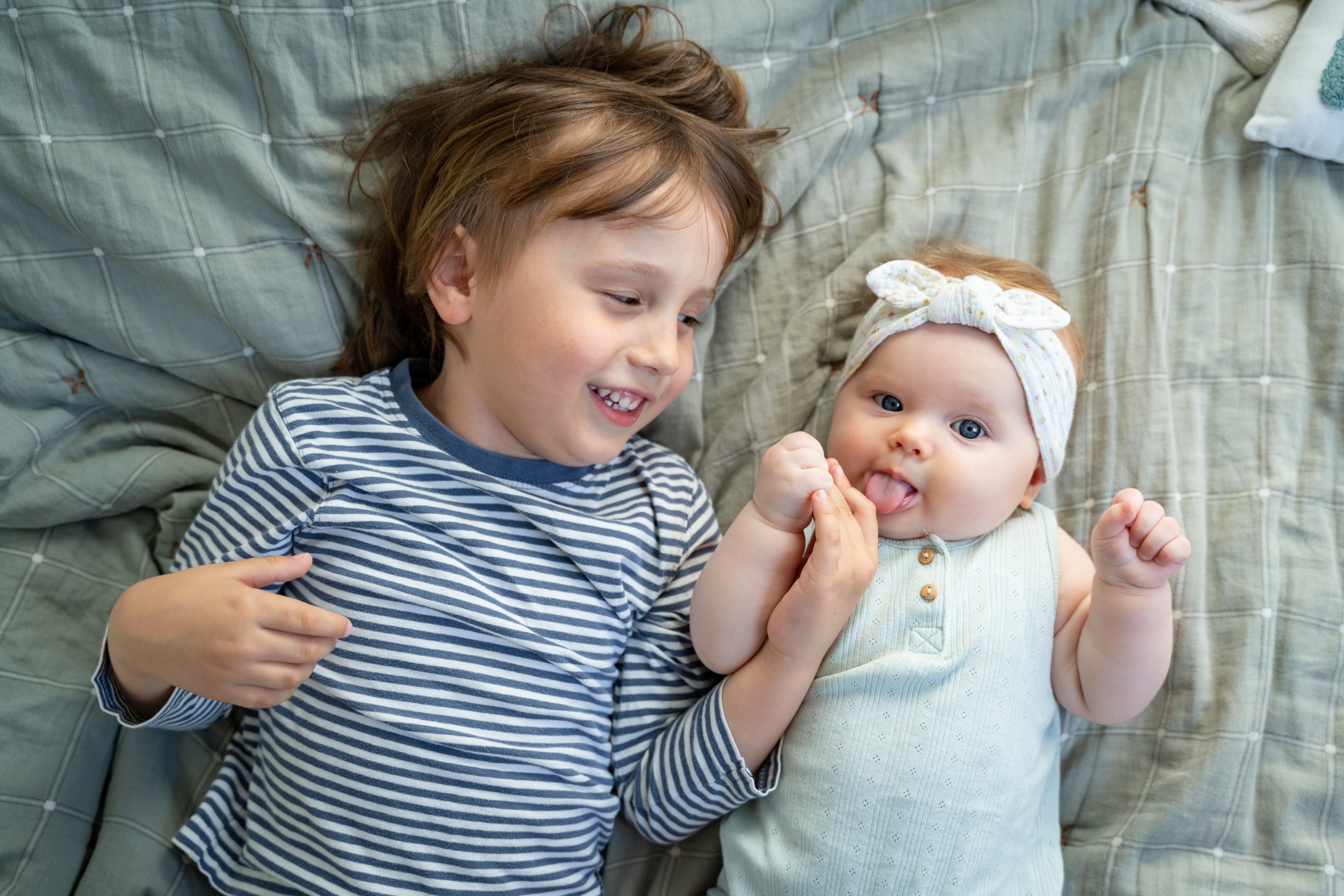 Sibling brother lying on bed with little sister. Preschool boy holding baby hand with tenderness and care. New family member, big family.